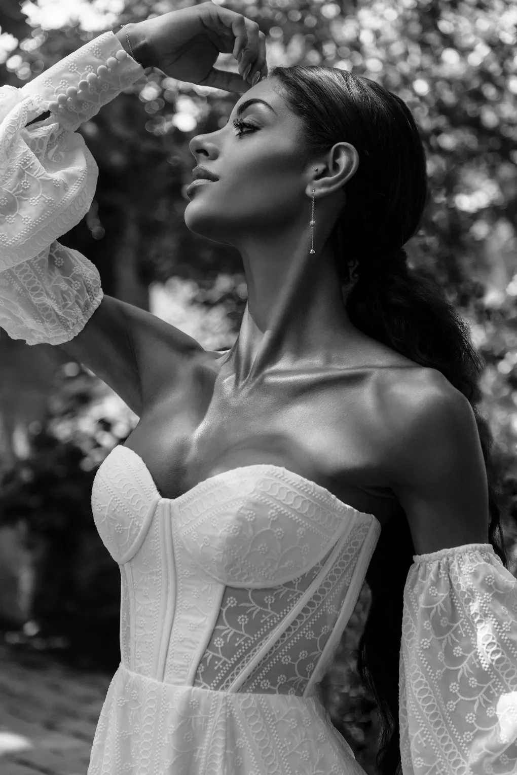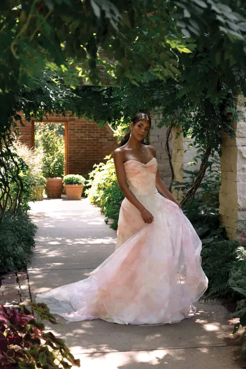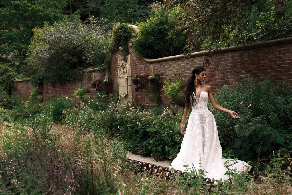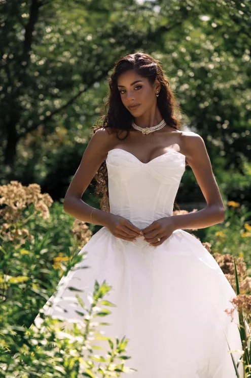 Right: “Dipti” by Amsale, price upon request, from For The One Bridal. Collector pearl bracelet, $145, and collector pearl necklace, $125, both by Lele Sadoughi. Marquis ear jacket earrings, $78, by Shashi.