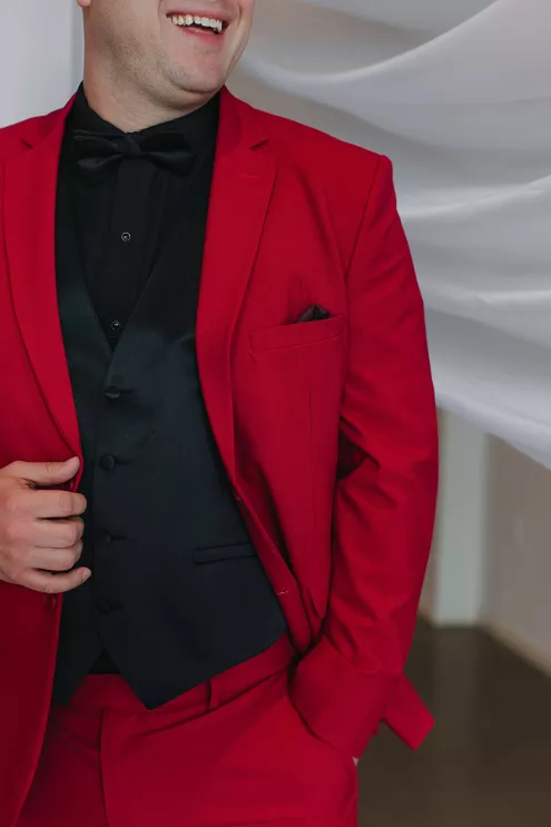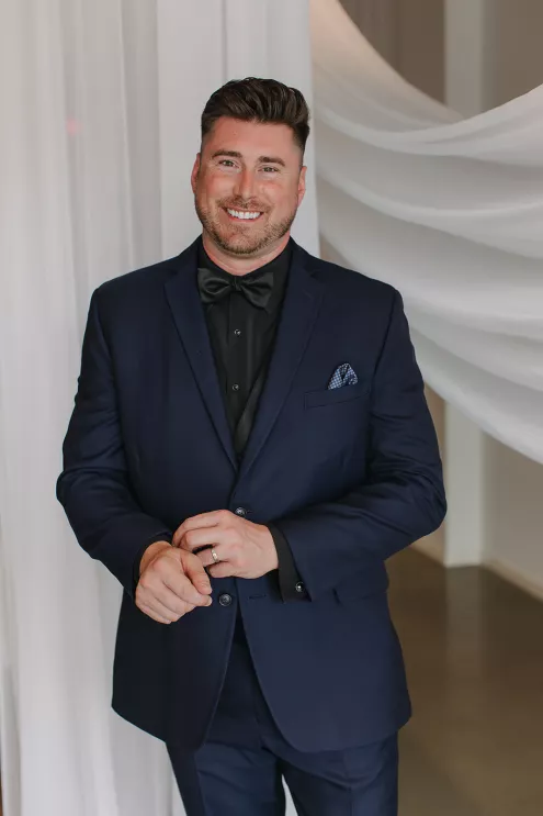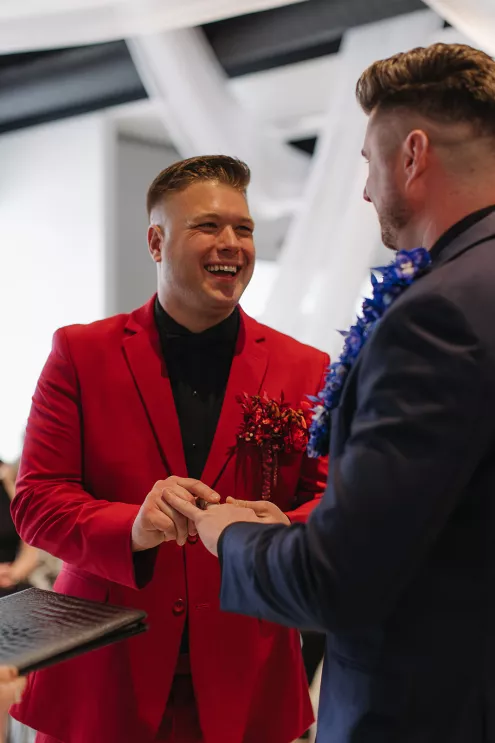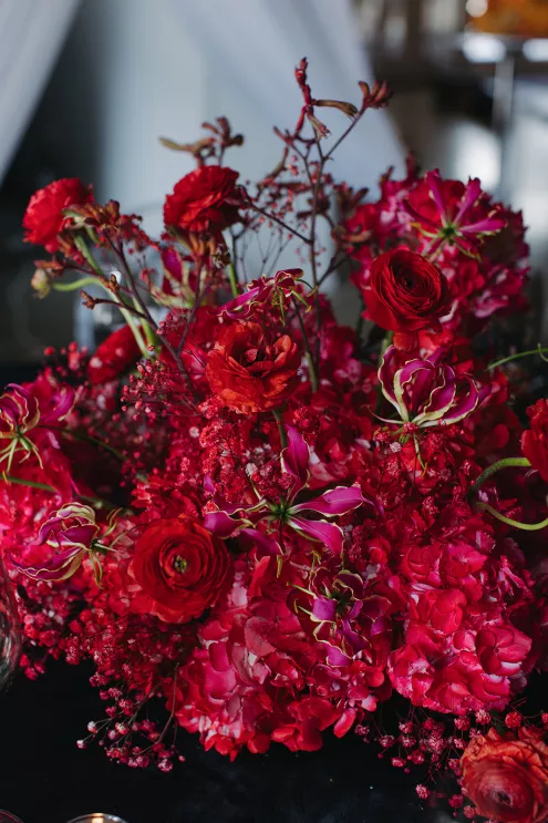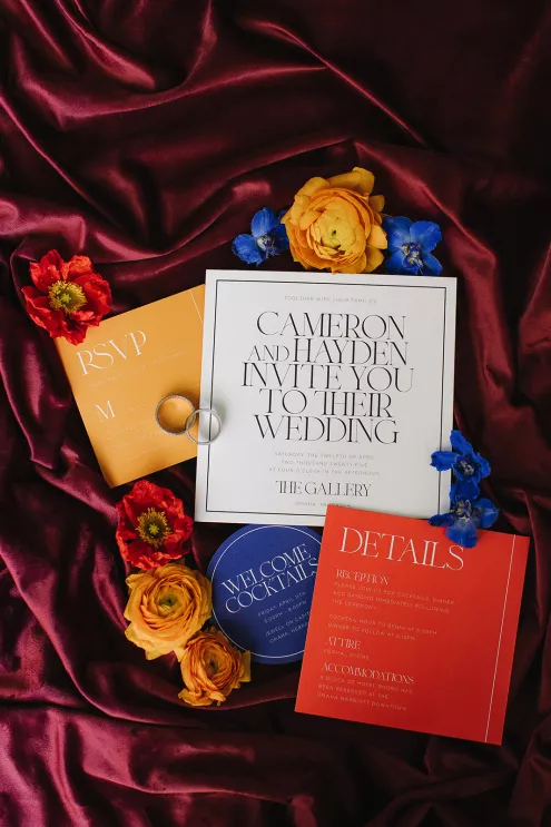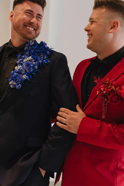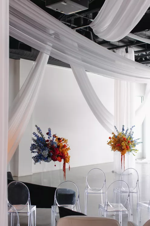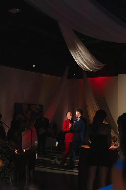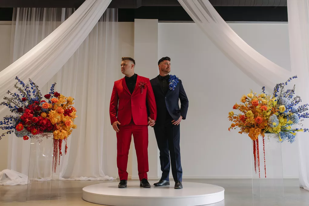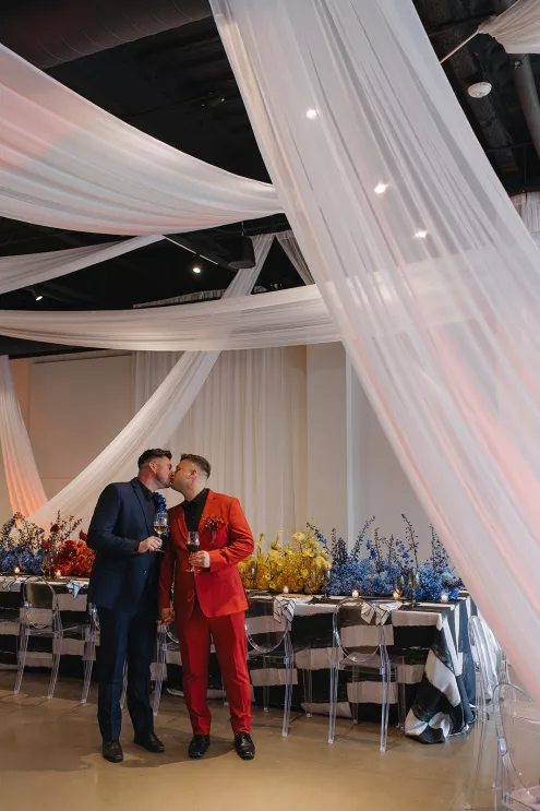The Gallery at Omaha Marriott Downtown at the Capitol District was transformed into a boldly creative reception brimming with style and artistic flair. Conceptualized by 402 Events, a black-and-white color scheme set the tone, while distinctive florals and flowing drapery added dimension and textural movement. “It was all about the stark white and sharp black, paired with deep, saturated sunset colors, with pronounced color blocking,” the team says. Both grooms made a statement: one in a sophisticated blue-on-blue ensemble with a floral lapel, the other in a bold red suit complemented by a luxe pocket square boutonniere. Vibrant florals atop pedestals framed the ceremony stage, while sleek chairs elevated the clean, contemporary aesthetic. “The ceremony set was styled to be more intimate and family focused, with both traditional chairs and soft seating arranged to encompass the couple and play off of existing architecture in the room,” 402 Events explains.