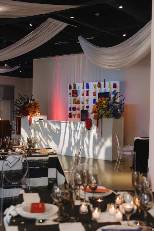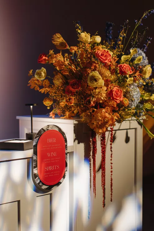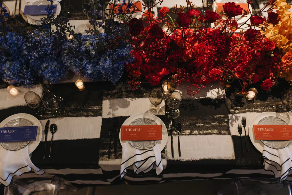 The reception featured drapery above tables dressed in black-and-white checkered tablecloths. To balance the patterned linens, each table held a single-shade floral centerpiece accompanied by a menu in the same color. The head table showcased a gradient floral runner, unifying the sunset hues throughout the venue. Behind the bar, glass bottles and vases in shades of blue, red, and orange were arranged to create an innovative backdrop. Custom lighting cast bespoke shadows that emphasized the bold design and added an avant-garde touch. From start to finish, the concept was steeped in creativity and explored ways to craft a one-of-a-kind wedding day.