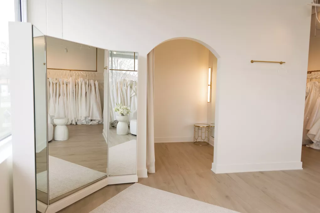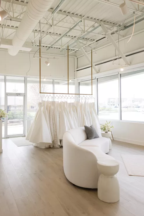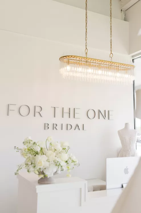 Bright new things are happening at FOR THE ONE BRIDAL (@fortheonebridal). After serving brides at Regency Shopping Center, the boutique has grown into a local favorite, offering a luxe experience for any bride-to-be. With growing popularity, owner and buyer Morgan Knuth knew it was time for an upgrade. “The build out of the new space was something we were super excited to tackle,” Knuth says. “This was our chance to elevate the For The One experience even more.” And elevate it they did—their new location at The Shops of Legacy boasts abundant natural light while still maintaining the intimacy of a private appointment. Grand mirrors, sleek design, and an airy atmosphere allow their carefully curated selection of gowns and accessories to shine, creating the perfect ambiance for brides to say “yes” to the dress. “From the opulent glass chandelier to the custom gold racks lined with gorgeous dresses, you should feel like you entered a chic bridal dream world,” Knuth shares.
