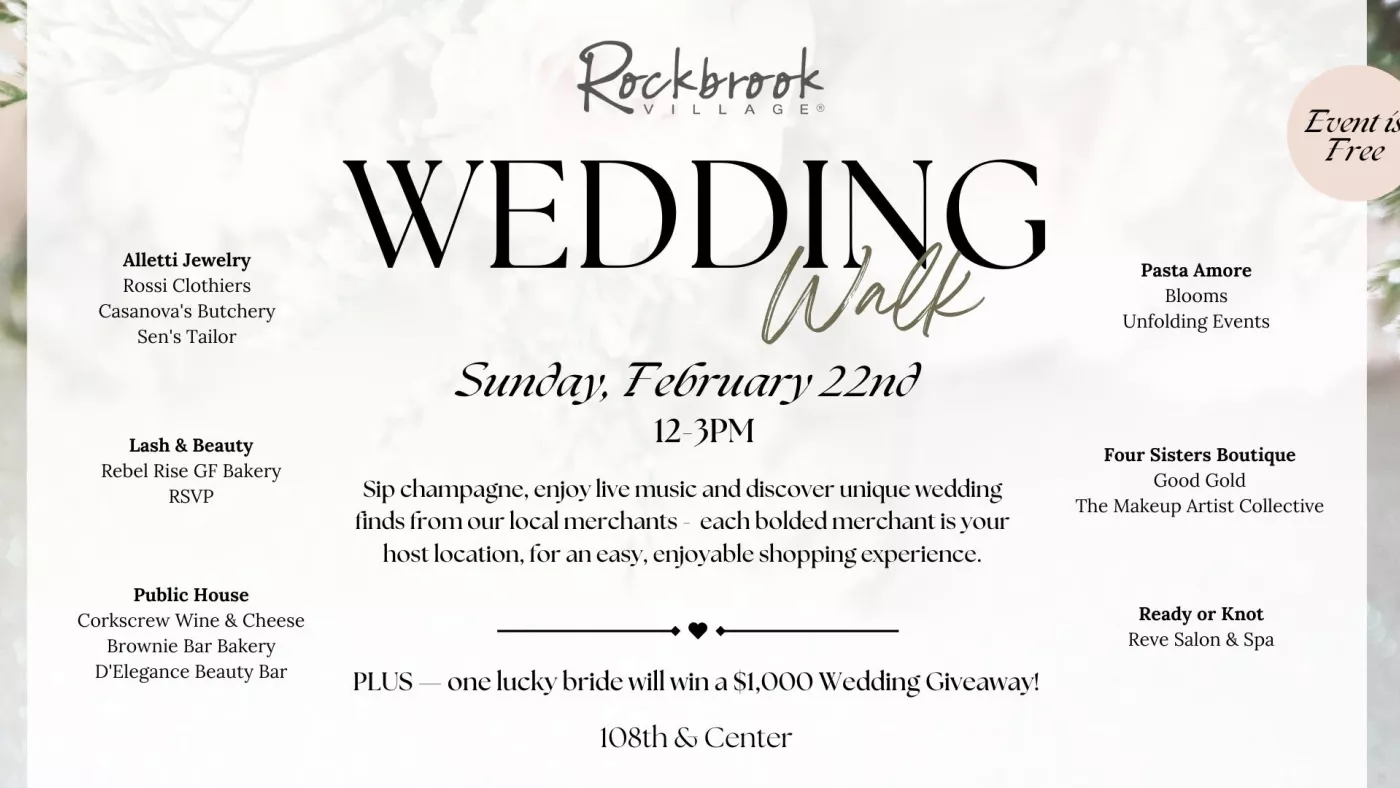 Join us for our first ever Wedding Walk. Sip champagne, enjoy live music and discover unique wedding finds from our Rockbrook Village merchants. Stop by any of our host locations (Pasta Amore, Four Sisters Boutique, Ready or Knot, Public House, Lash & Beauty or Alletti Jewelry) and discover a total of 19 merchants who offer wedding finds to make your special day one to remember.