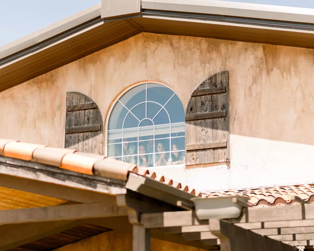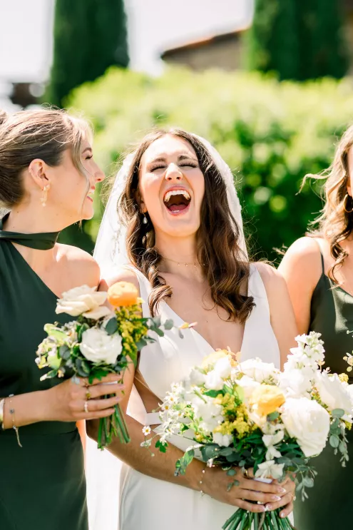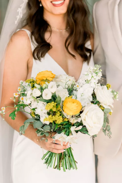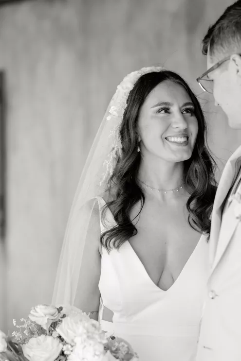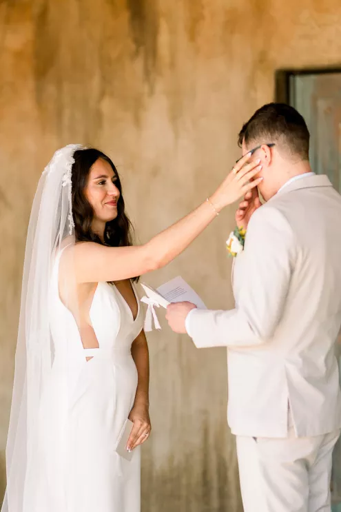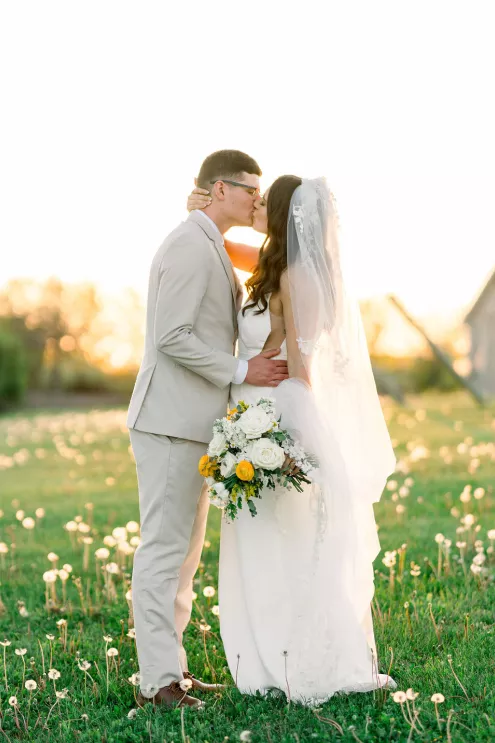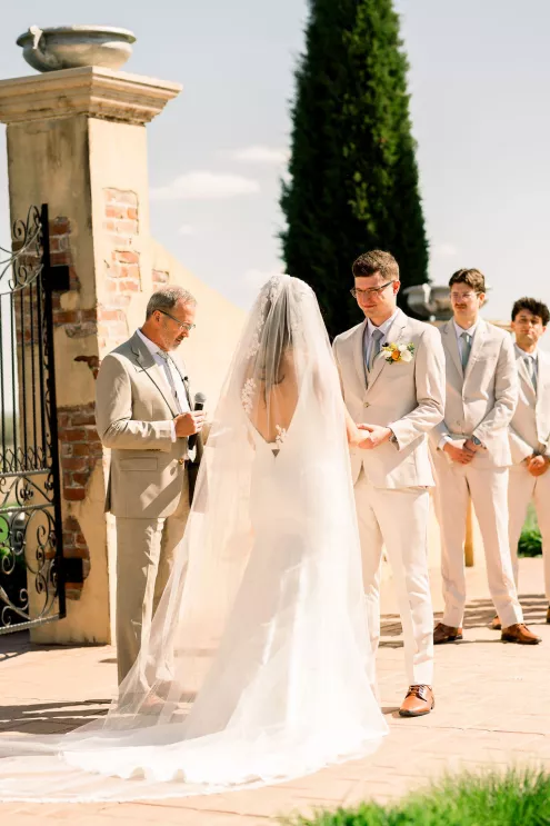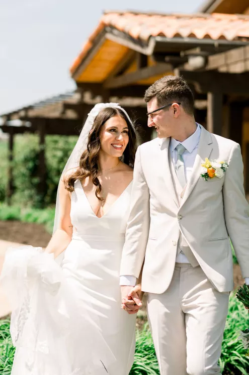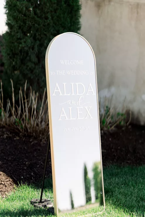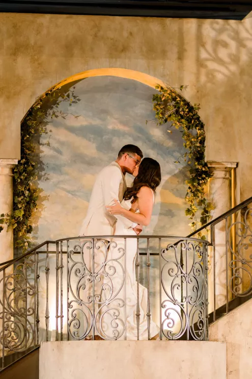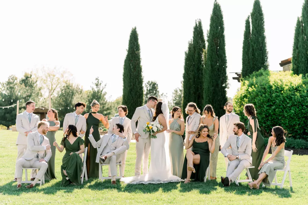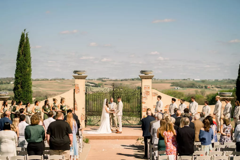 Alida Beste and Alex Frisbie were living in different states in 2019 when they first connected playing Fortnite together. While they both hoped to win a Victory Royale, they found something even better. They kept in touch, becoming online gaming friends before beginning a long-distance relationship during college. After graduation, the couple settled in Nebraska, and in 2023, during a vacation in Hawaii, Alex proposed to Alida at sunset on the beach. Their wedding took place at Bella Terre Vineyard, a rustic venue inspired by the Italian countryside. The vineyard provided a picturesque backdrop for the ceremony, with an intricate iron gate and limewashed walls serving as the altar. Alida wore a classic dress with a daring open back, complemented by a trailing veil with floral appliqués. To complement the eucalyptus in the floral design, bridesmaids wore varying shades of green, while Alex and his groomsmen opted for sage green ties paired with light-colored suits. The flower arrangements echoed the warm tones of the venue—creams, yellows and sunset orange, accenting the terracotta details and exposed brickwork. Following the ceremony, friends and family moved inside the venue hall, which was designed to evoke a charming European city, with walls depicting Italian street views. Alida and Alex entered through a hidden entrance in one of the storefronts and descended into a dramatic staircase to join the celebration. The reception featured many personal touches, including an ice cream bar, a specialty cocktail named after their dog, Jynx, and plenty of Coldplay songs to dance the night away.