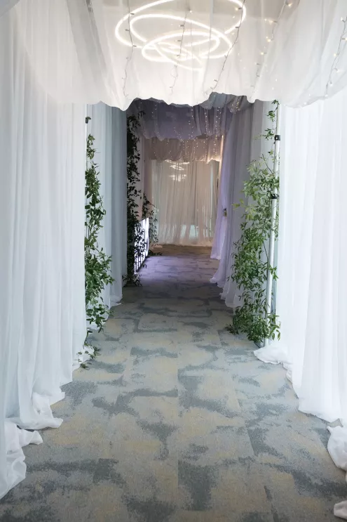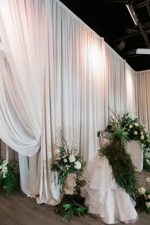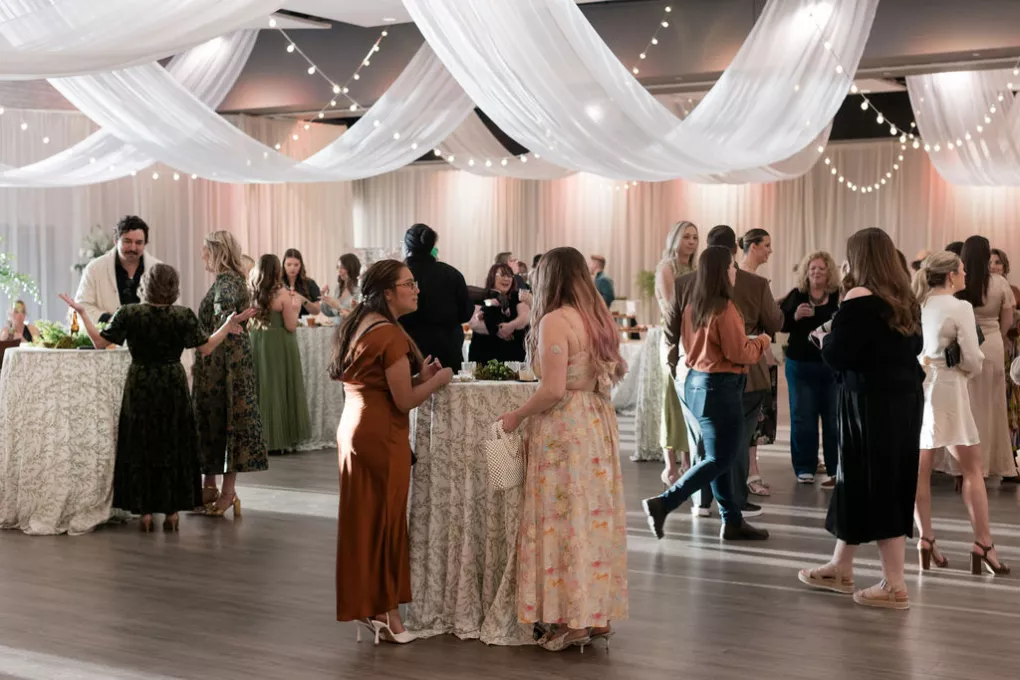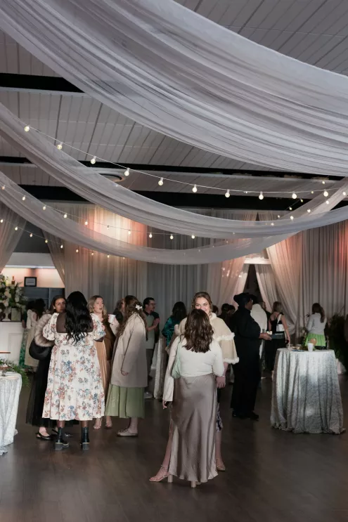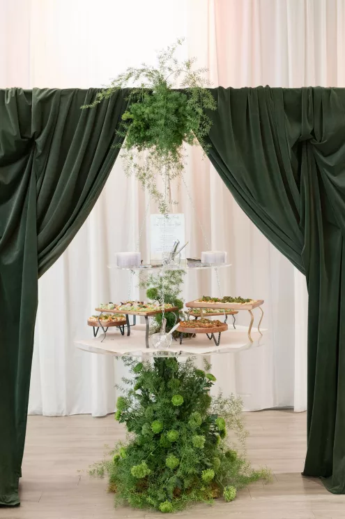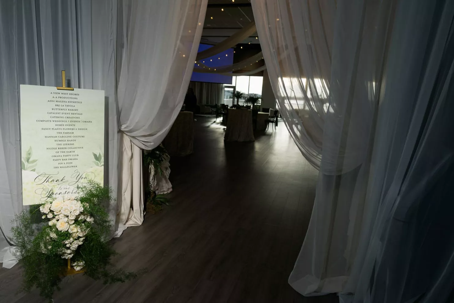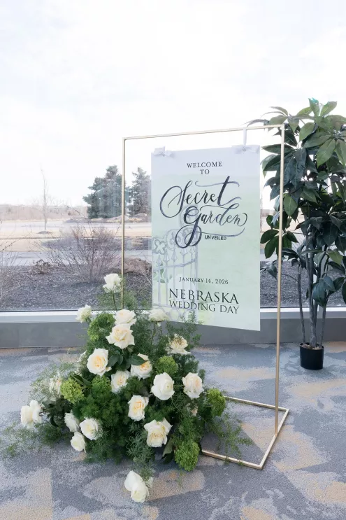 Guests arrived to a striking welcome installation by Fancy Plants Flowers & Design, setting the tone for the garden-forward experience. Inside, Catalyst Event Rentals layered the space with thoughtful furnishings, while BBJ La Tavola linens added refined texture to cocktail tables throughout the venue. Backdrops by The Wallflower Omaha and Nicole Reher Creative created photo-worthy moments, complemented by custom signage and graphics from Humble Hands.