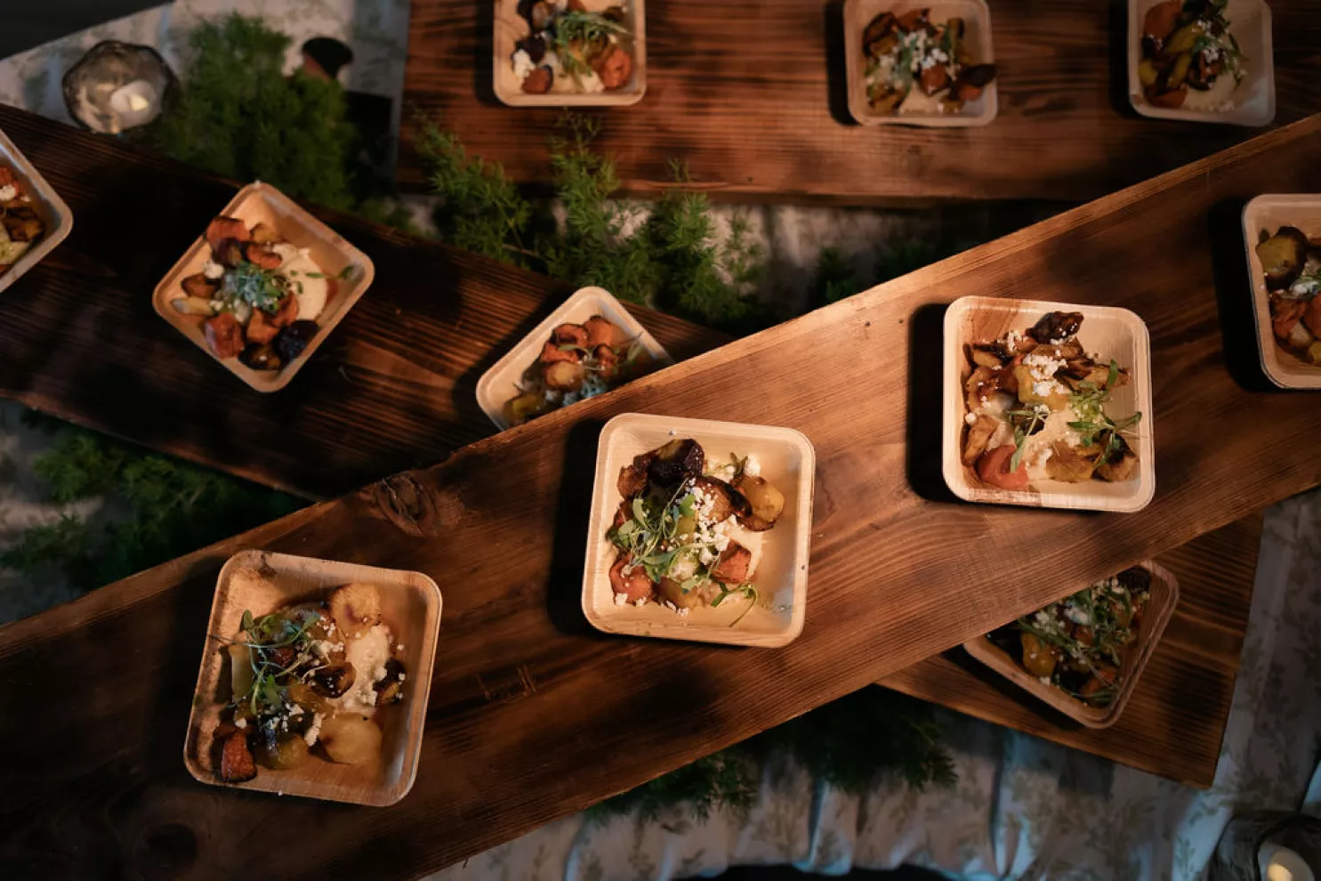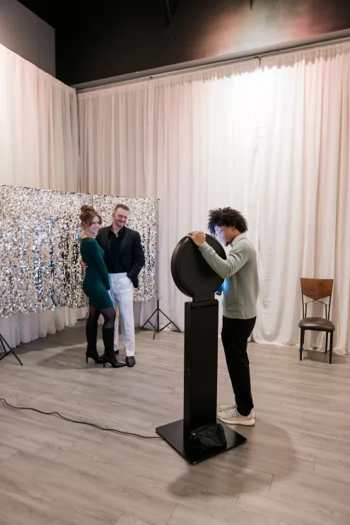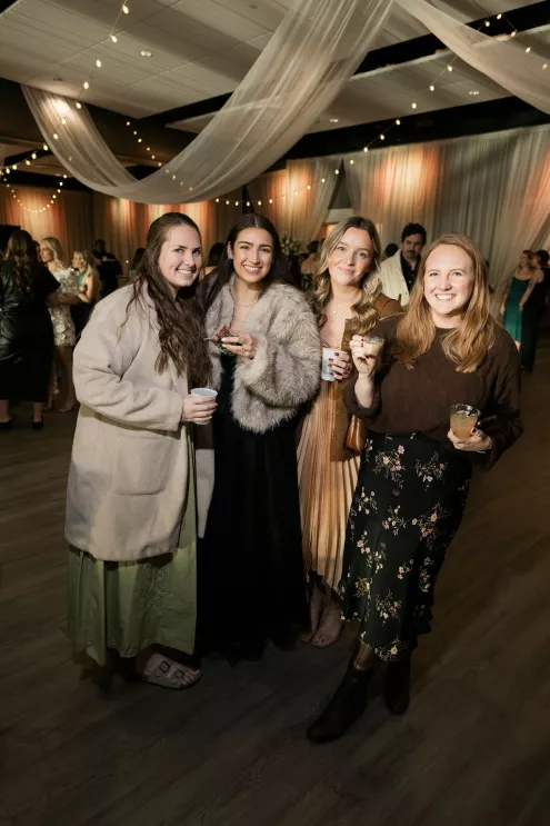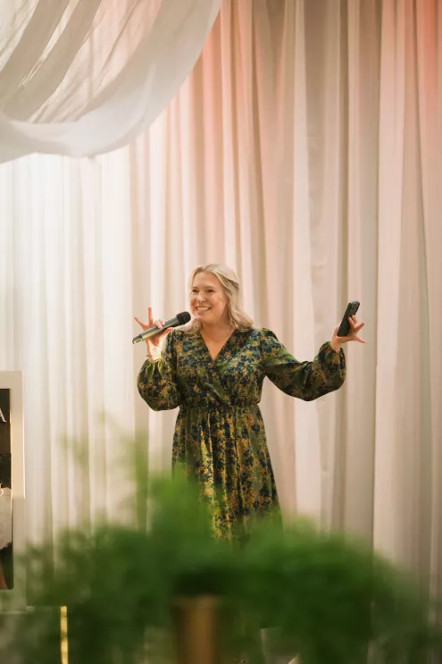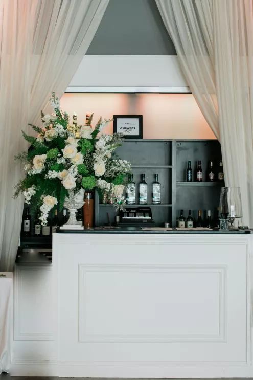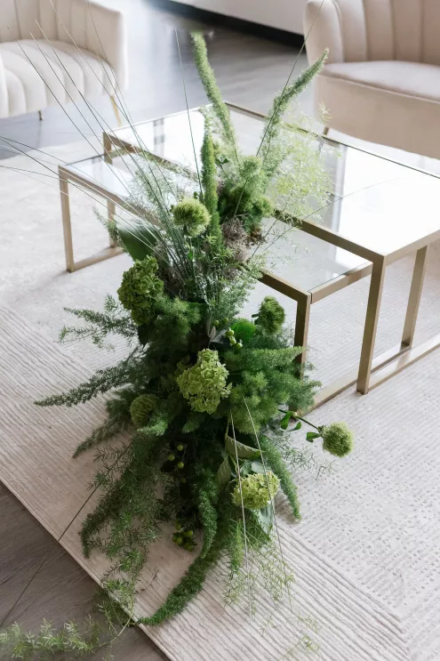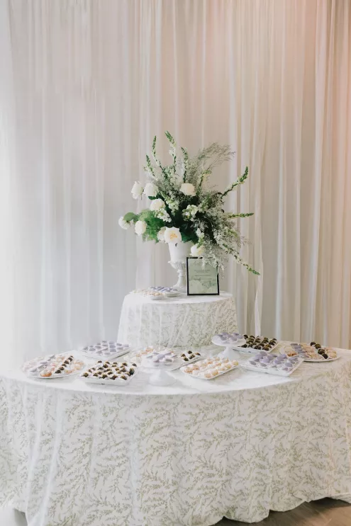 Guests arrived to a striking welcome installation by Fancy Plants Flowers & Design, setting the tone for the garden-forward experience. Inside, Catalyst Event Rentals layered the space with thoughtful furnishings, while BBJ La Tavola linens added refined texture to cocktail tables throughout the venue. Backdrops by The Wallflower Omaha and Nicole Reher Creative created photo-worthy moments, complemented by custom signage and graphics from Humble Hands.