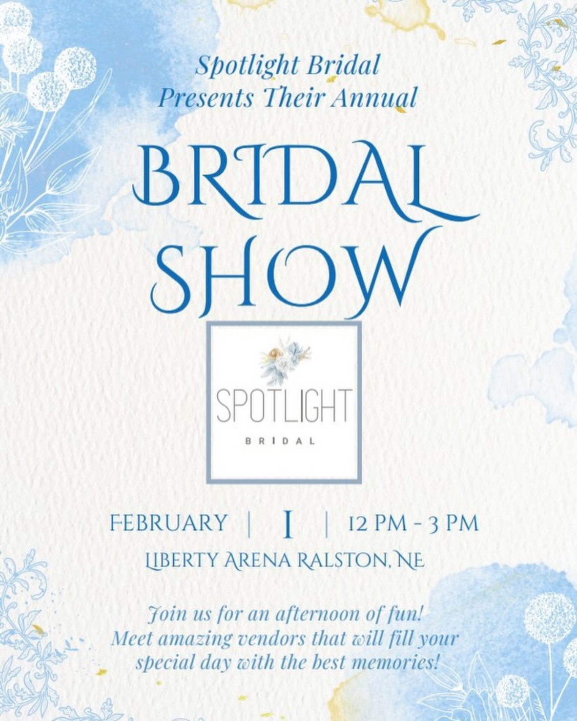 Find more information at the link below! Spotlight Bridal Show DATE AND TIME Sunday, February 1st, 2026 12:00pm - 3:00pm Location Liberty Arena Ralston, NE United States Register Here!