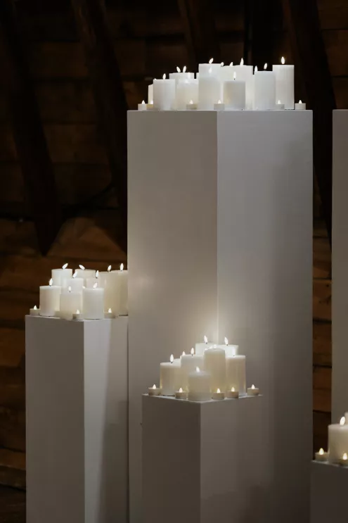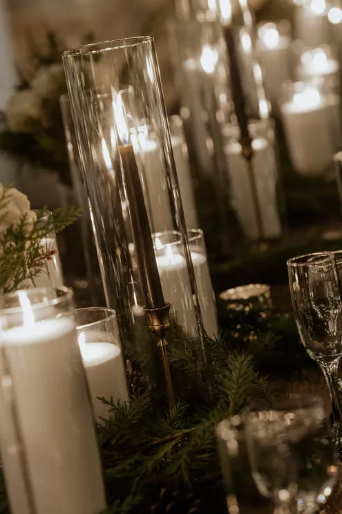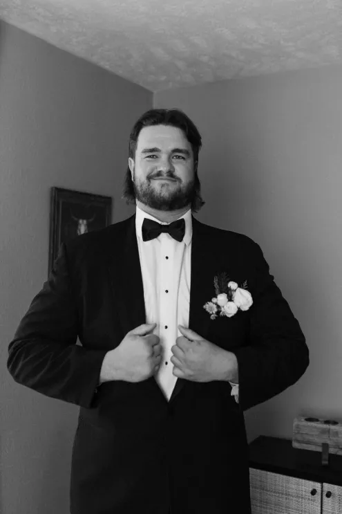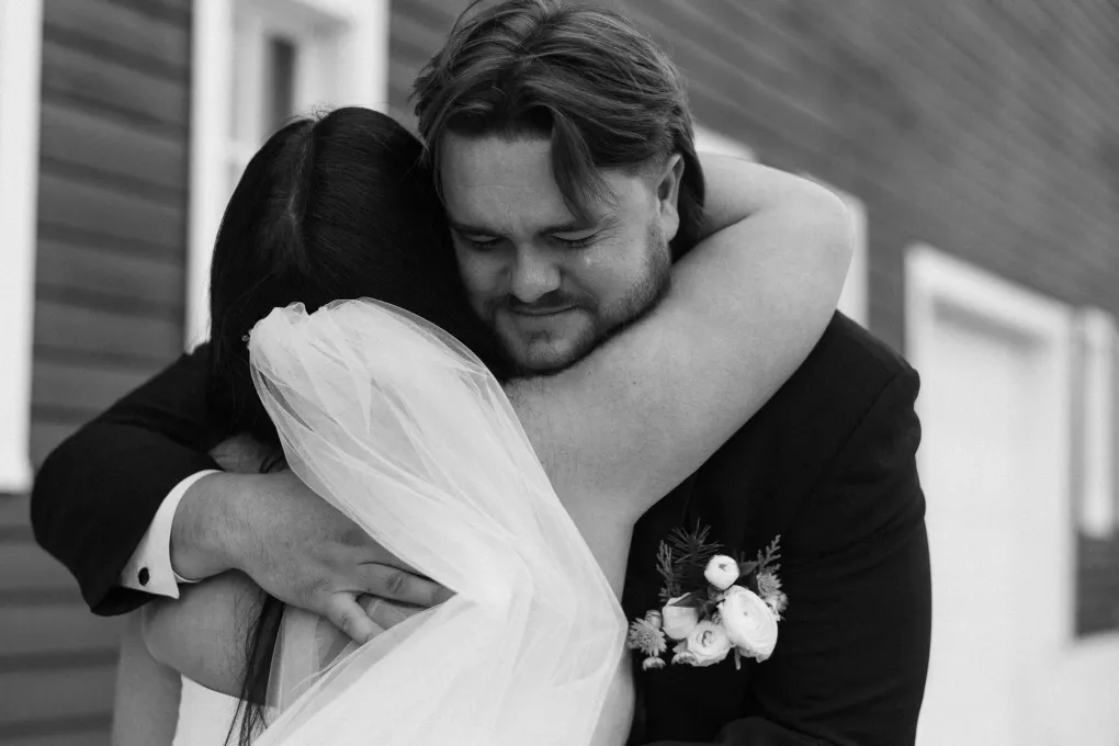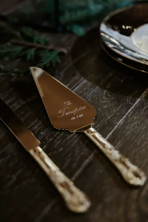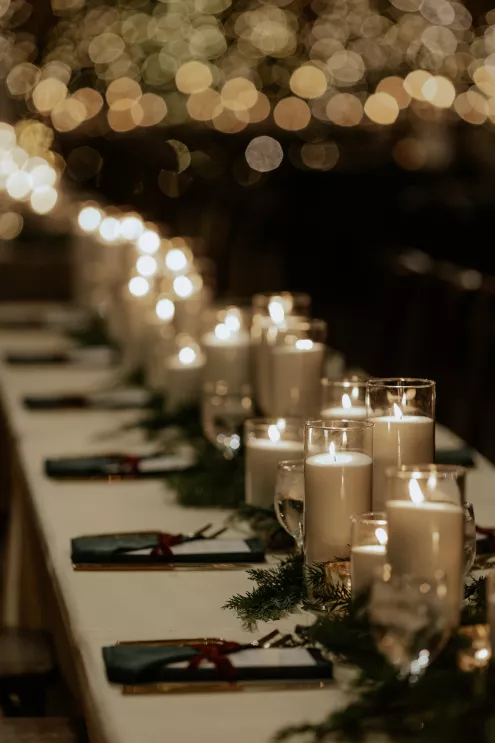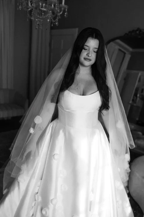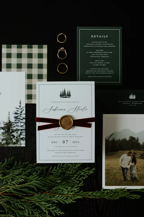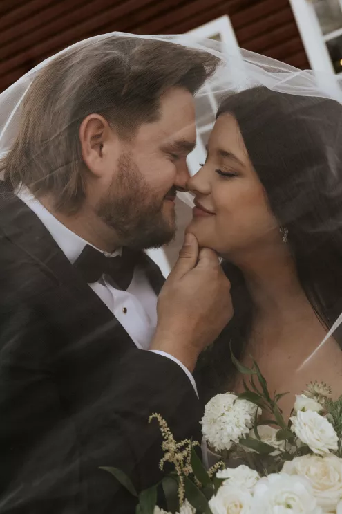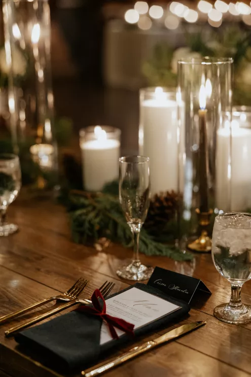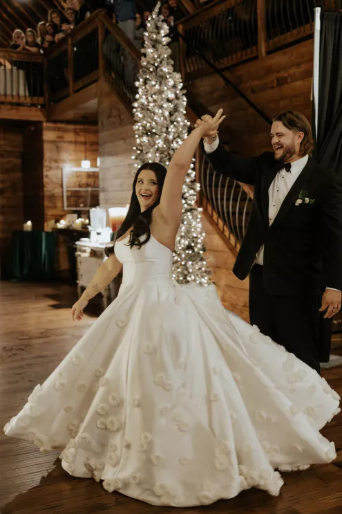 Despite growing up an ocean apart, Sabrina Steele and Trey Tenopir’s worlds collided in the restaurant where she worked. After catching a glimpse of him from across the bar, Sabrina convinced her co-worker to switch sections with her, allowing her to be closer to Trey—and the rest was history! Having transitioned into the world of marketing and social media, Sabrina and her mother set out to design a “Colorado winter” inspired wedding set at The Barn at the Ackerhurst Dairy Farm. The pair began their big day by sharing letters written by Sabrina with their parents in private, tearful moments before joining together for their first look. As a long-time fan of "Say Yes to the Dress," Sabrina experienced her own Kleinfeld moment by wearing a jaw-dropping, strapless ballgown, adorned with white appliqué flowers at the base of the skirt and a matching veil. Trey donned a classic black tux and glossy eyes as he awaited his bride at the end of the candlelit aisle, a dramatic backdrop of pre-lit Christmas trees behind him. Forest elegance was incorporated into every stunning detail of the reception space, from the cranberry-colored ribbons on each napkin that matched the bridesmaid dresses to the evergreen runner and mixed taper and pillar candles that ran the length of the wooden head table to the 3D rocky mountain art piece displayed on the front of the DJ booth that mirrored the woodsy design of the two-tiered cake. After presenting a bouquet to her mother to honor all her hard work and help during the planning process, Sabrina and Trey took to the dance floor alongside their “party hard” crew, dancing and laughing the night away.